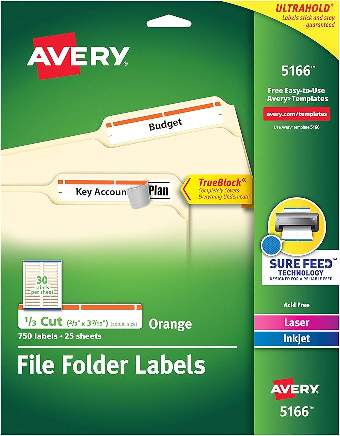 Amazon.com : AVERY 5166 Permanent File Folder Labels, TrueBlock, Inkjet/Laser, Orange Border ...